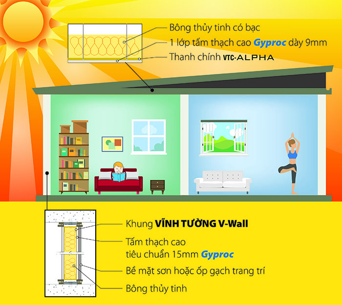 Để đạt hiệu quả tốt nhất, trần nhà cũng nên được tích hợp tính năng chống nóng bằng lớp tấm thạch cao để đồng bộ giải pháp.